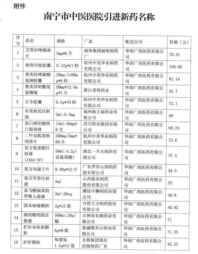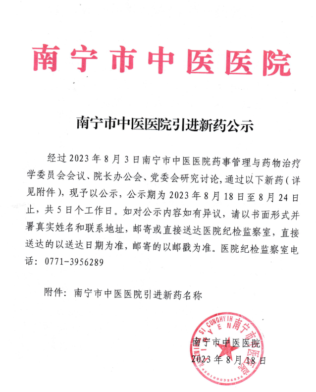 【南宁市中医医院】广西壮族自治区南宁市中医医院引进新药公示