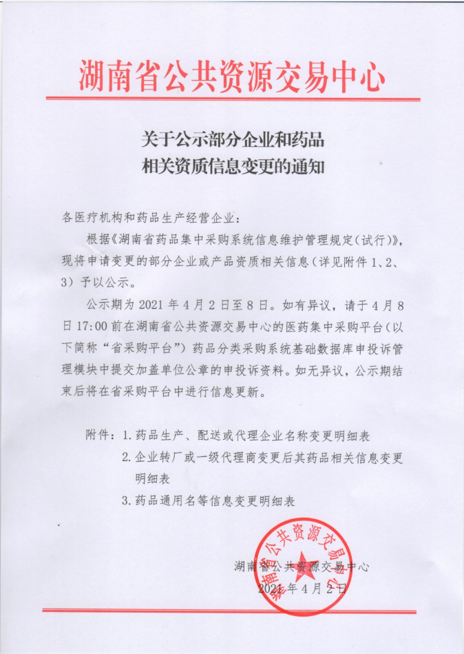 【湖南】2021年湖南省关于公示部分企业和药品相关资质信息变更的通知