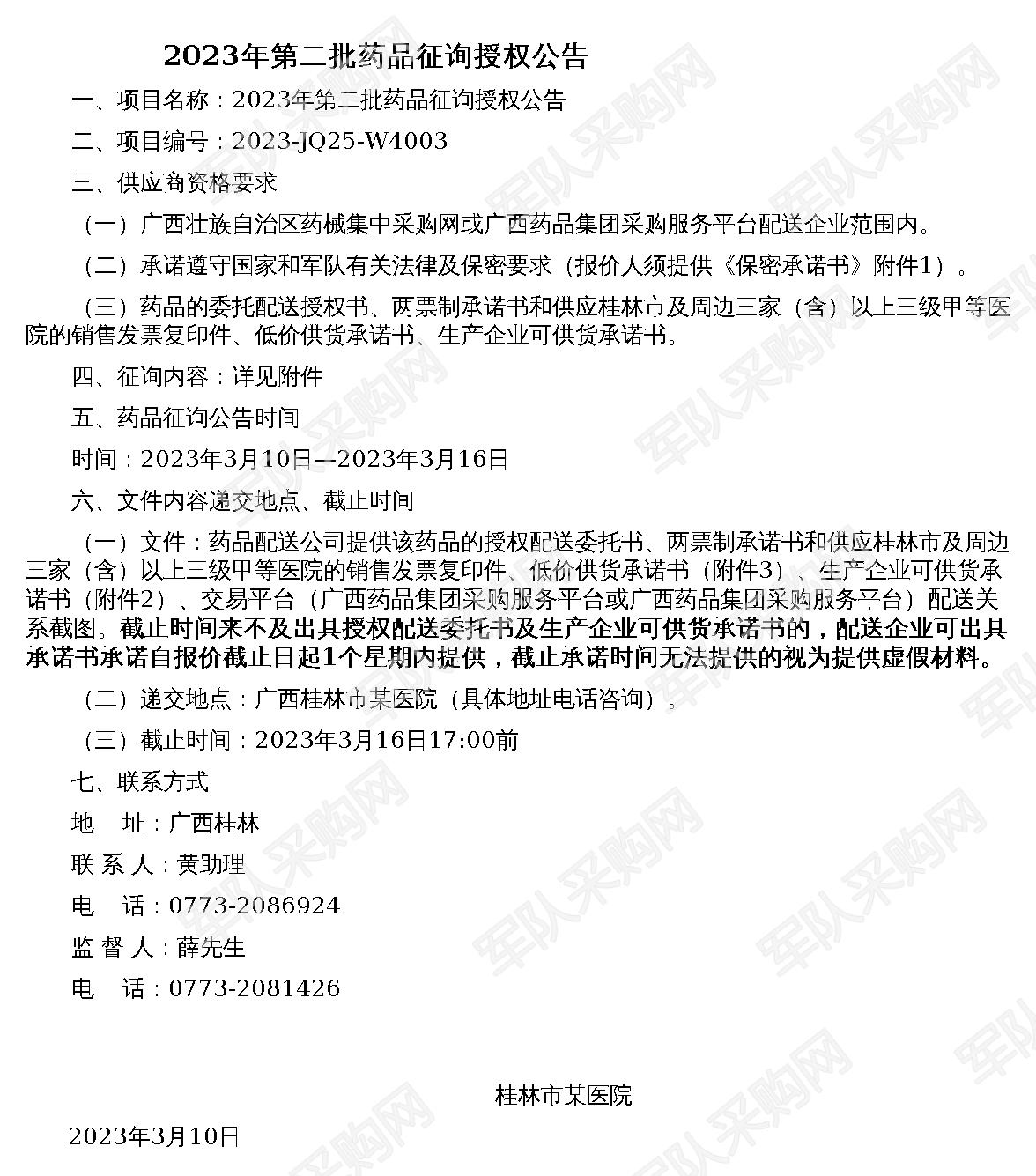 【军队采购】军队采购网某医院2023年第二批药品征询授权公告(2023-JQ25-W4003)