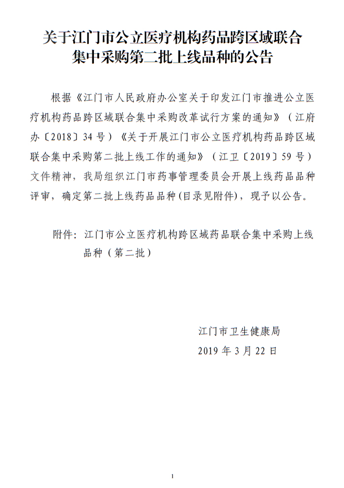 【江门】广东省关于江门市公立医疗机构药品跨区域联合集中采购第二批上线品种的公告