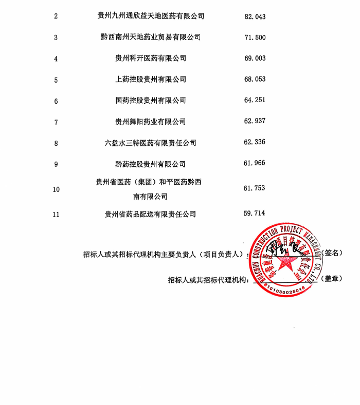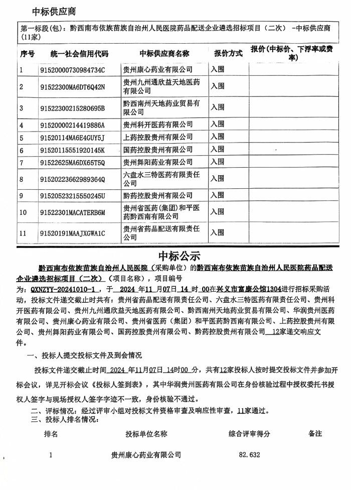 【黔西南布依族苗族自治州人民医院】贵州省黔西南布依族苗族自治州人民医院药品配送企业遴选招标项目(二次)中标公示