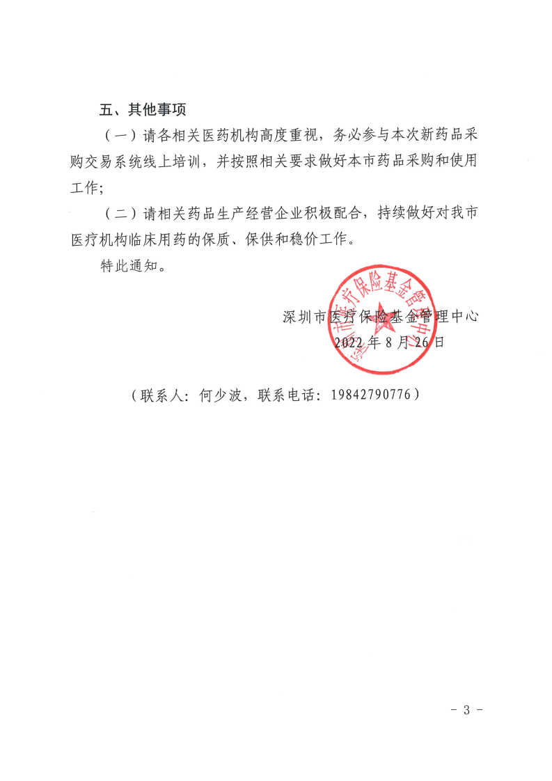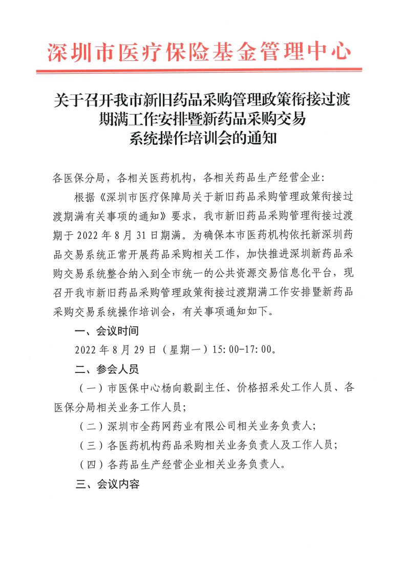 深圳市医疗保险基金管理中心拟于2022年8月29日15:00-17:00召开新旧药品采购管理政策衔接过渡期满工作安排暨新药品采购交易系统线上培训会,深圳交易平台现转发《深圳市医疗保险基金管理中心关于召开我市新旧药品采购管理政策衔接过渡期满工作安排暨新药品采购交易系统线上培训会的通知》,请相关单位高度重视、积极参会。