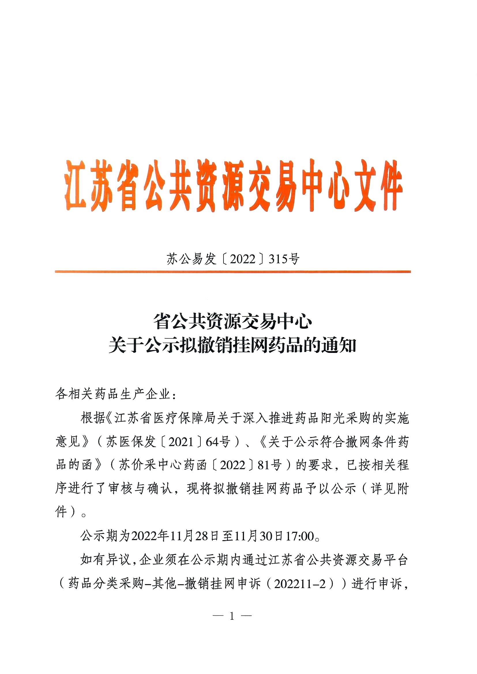 根据《江苏省医疗保障局关于深入推进药品阳光采购的实施意见》(苏医保发〔2021〕64号)、《关于公示符合撤网条件药品的函》(苏价采中心药函〔2022〕81号)的要求,已按相关程序进行了审核与确认,现将拟撤销挂网药品予以公示(详见附件)。