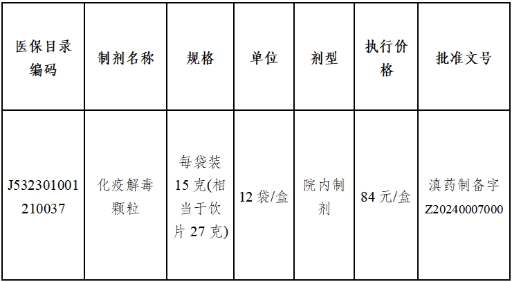 根据国家发改委等6部门《关于印发推进药品价格改革意见的通知》(发改价格〔2015〕904号)《楚雄州发展和改革委员会转发废止药品价格文件的通知》(楚发改价格〔2015〕22号)文件精神。为了提高患者用药的便捷性,我院基于“化疫解毒合剂”的传统配方,新增了颗粒剂型——“化疫解毒颗粒”目前已取得云南省药品监督管理局的药品备案号和国家医保编码。按照文件要求,在执行前一周进行公示,现将执行价格公示如下: