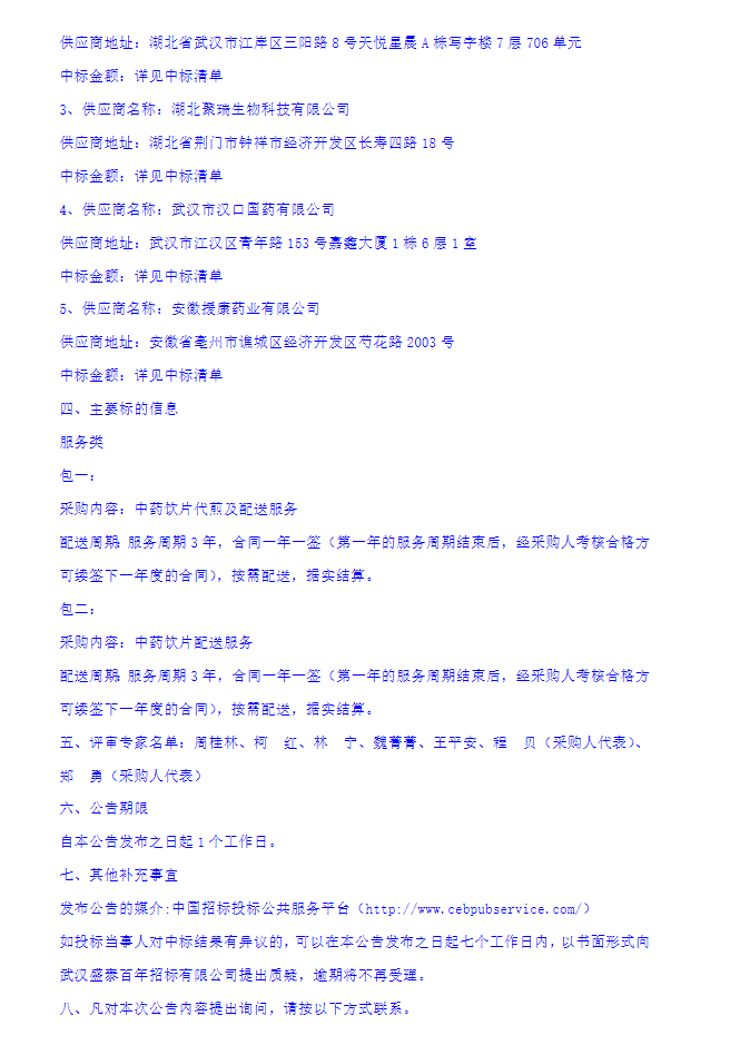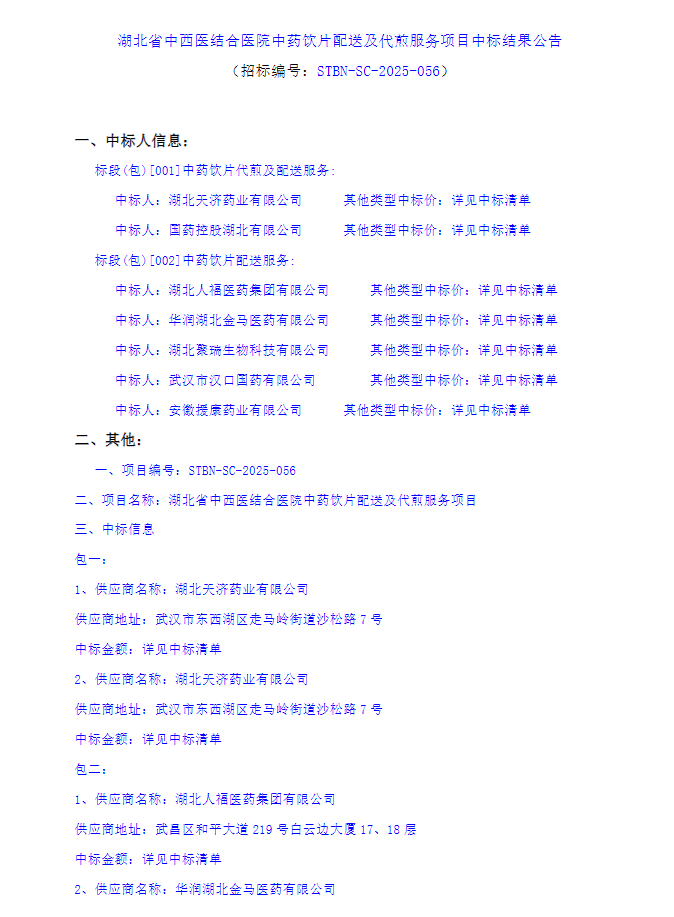 【湖北省中西医结合医院】湖北省中西医结合医院中药饮片配送及代煎服务项目中标结果公告