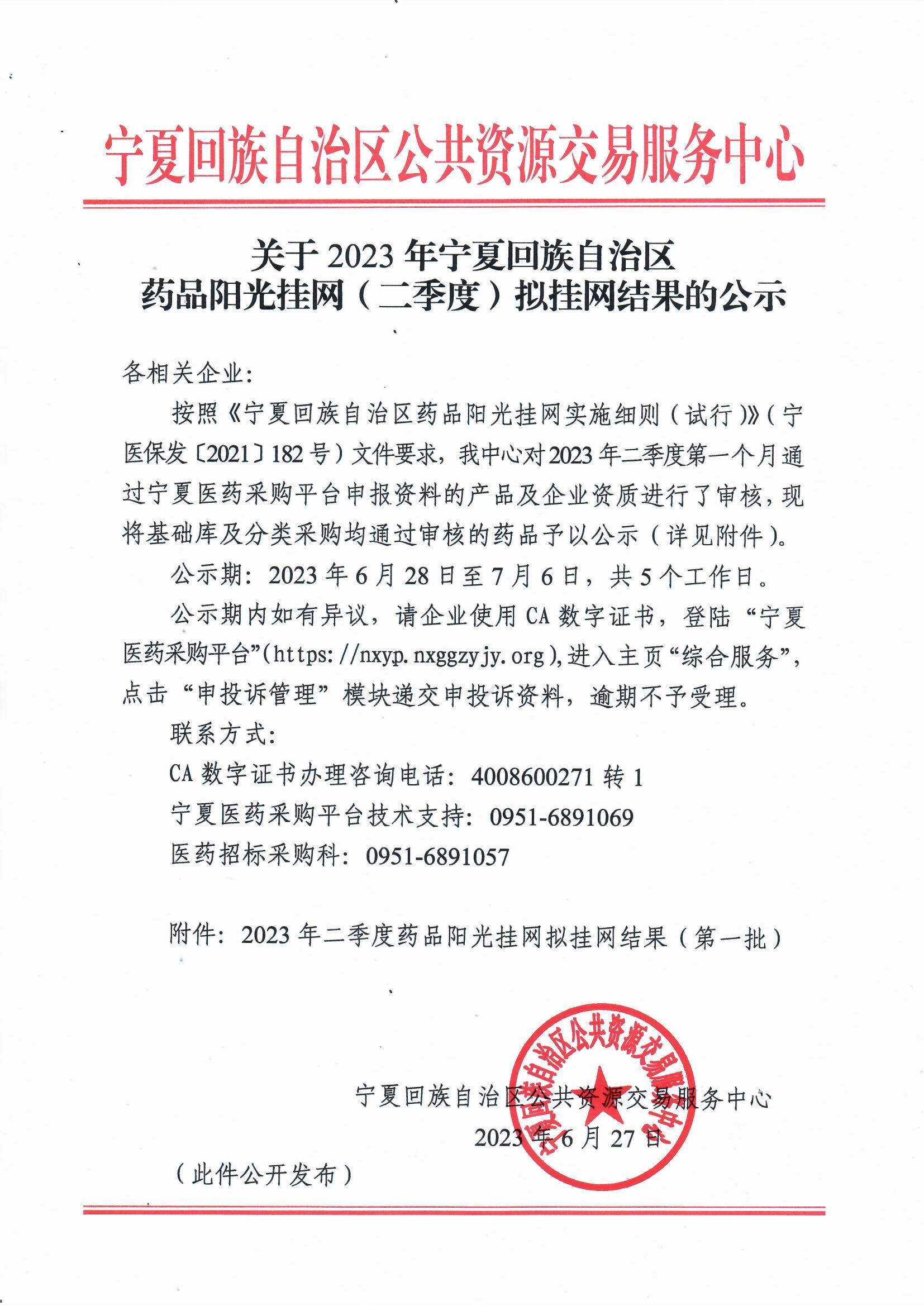 按照《宁夏回族自治区药品阳光挂网实施细则(试行)》(宁医保发〔2021〕182号)文件要求,我中心对2023年二季度第一个月通过宁夏医药采购平台申报资料的产品及企业资质进行了审核,现将基础库及分类采购均通过审核的药品予以公示(详见附件)。