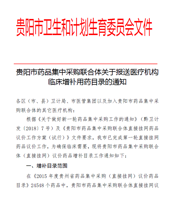 【贵阳】贵州省贵阳市药品集中采购联合体关于报送医疗机构临床增补用药目录的通知