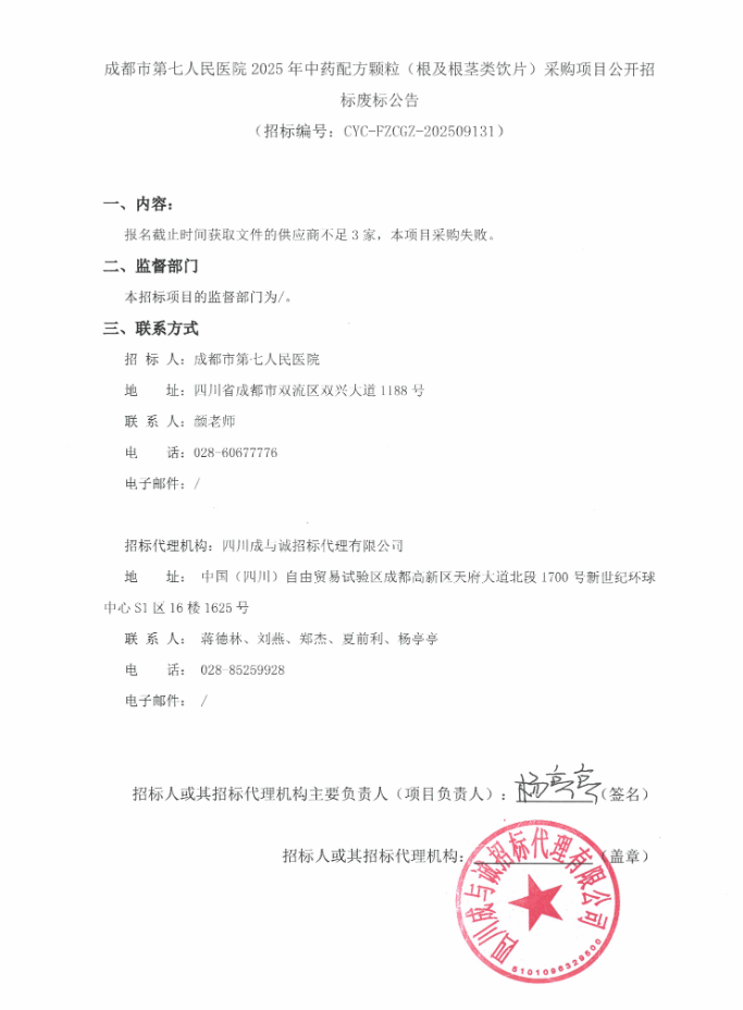 【成都市第七人民医院】四川省成都市第七人民医院2025年中药配方颗粒(根及根茎类饮片)采购项目公开招标废标公告