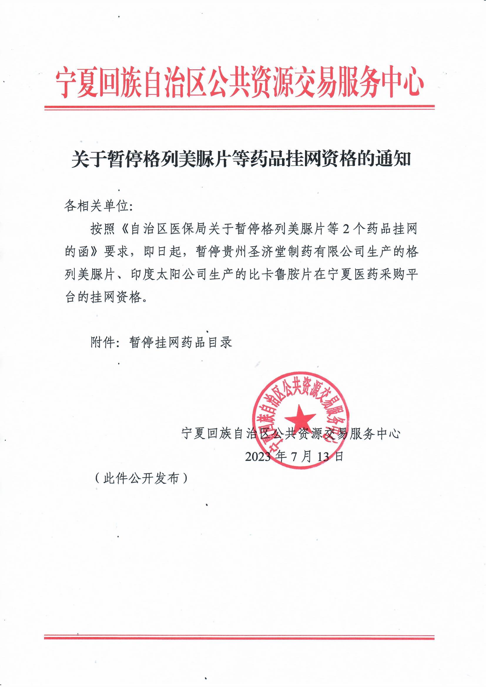 【宁夏】关于暂停格列美脲片等药品挂网资格的通知