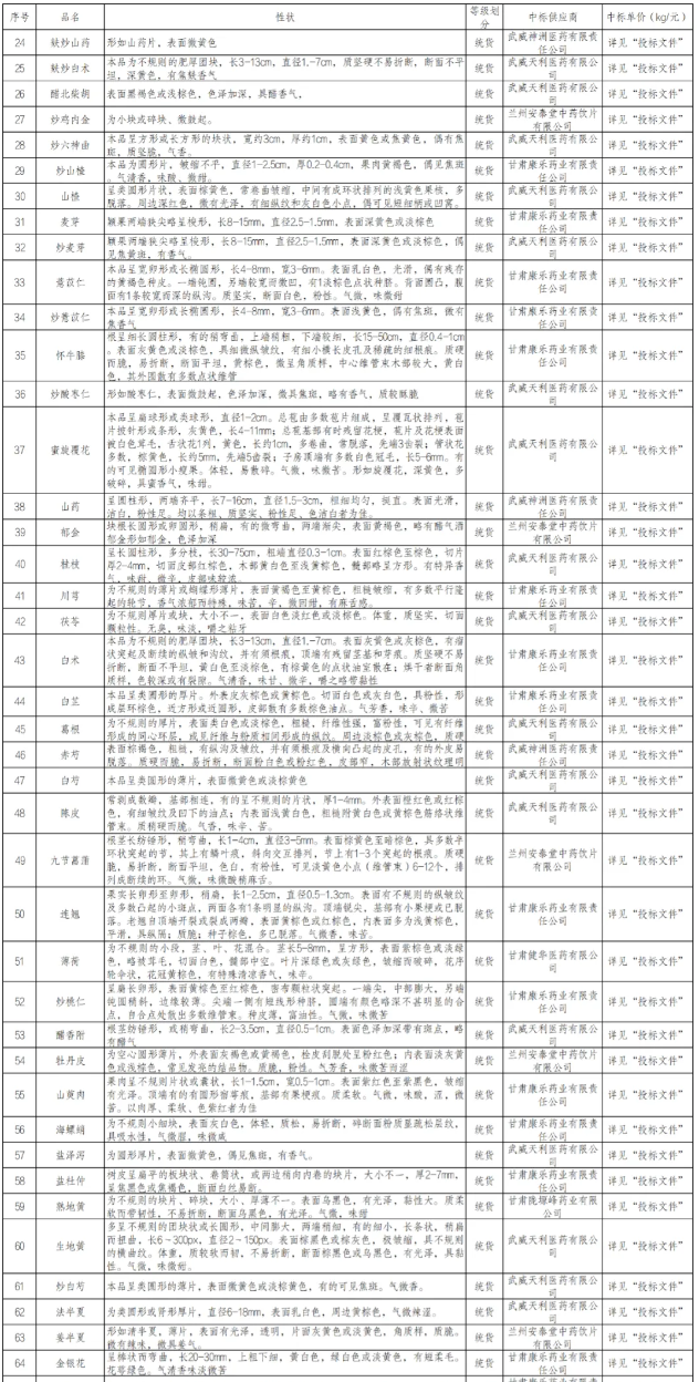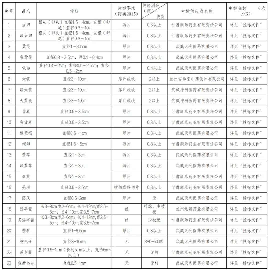 古浪县中医医院为进一步规范医院中药饮片、中药配方颗粒和中药膏剂配方颗粒采购工作,保证所采购中药饮片、中药配方颗粒和中药膏剂配方颗粒质优价廉,确保采购过程的公平、公正、公开,保证中药饮片、中药配方颗粒和中药膏剂配方颗粒质量。于2024年4月12日中药饮片、中药配方颗粒和中药膏剂配方颗粒采购项目进行招标,现将评标结果公布如下: