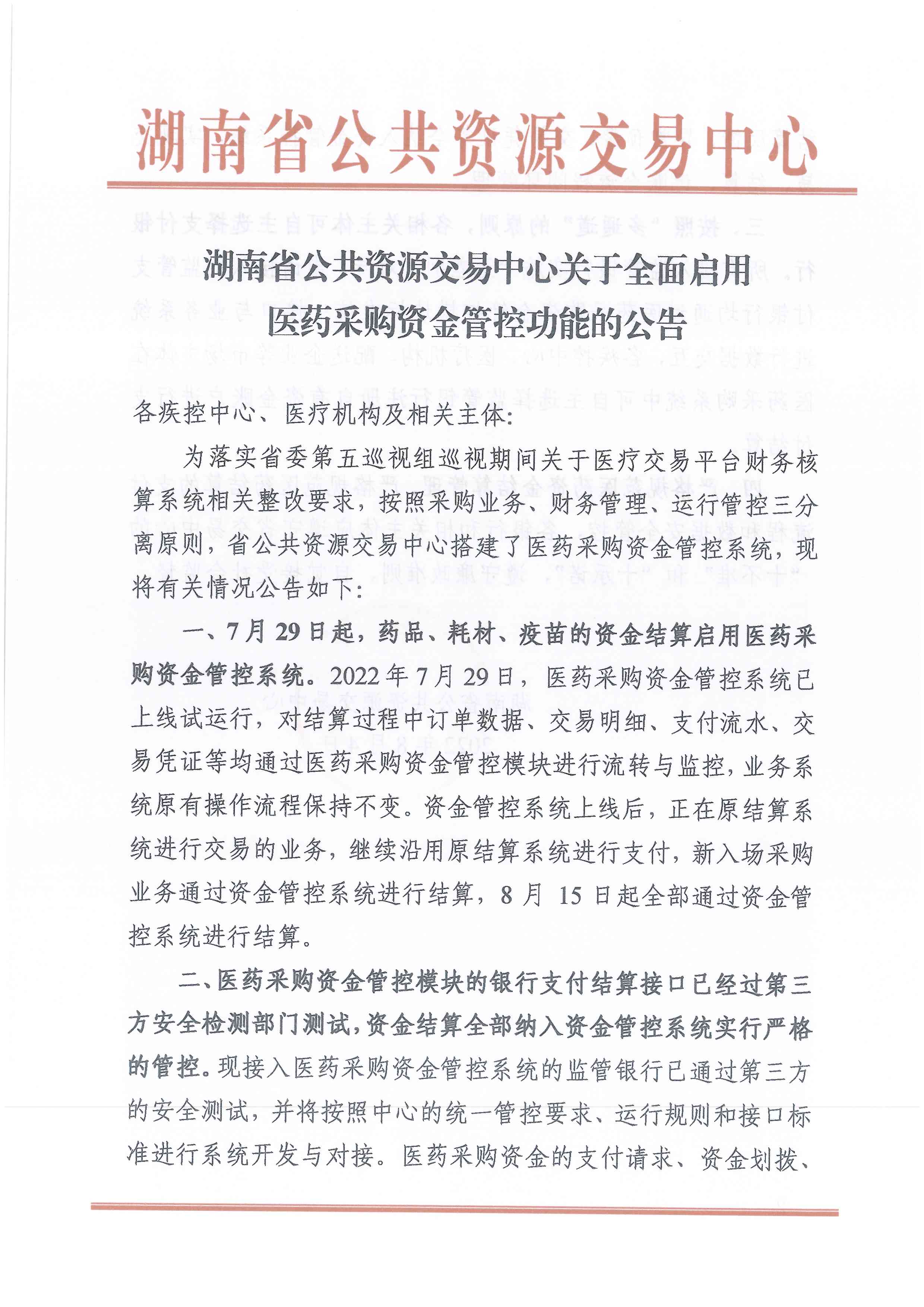 【湖南】湖南省公共资源交易中心关于全面启用医药采购资金管控功能的公告