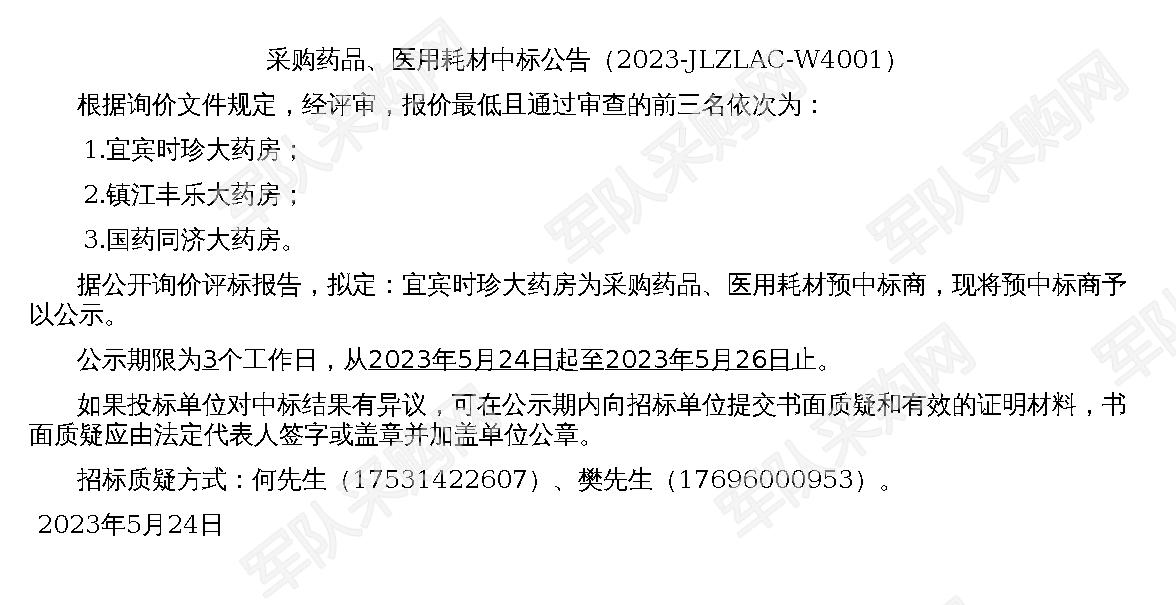 【军队采购】军队采购网采购药品、医用耗材中标公告(2023-JLZLAC-W4001)
