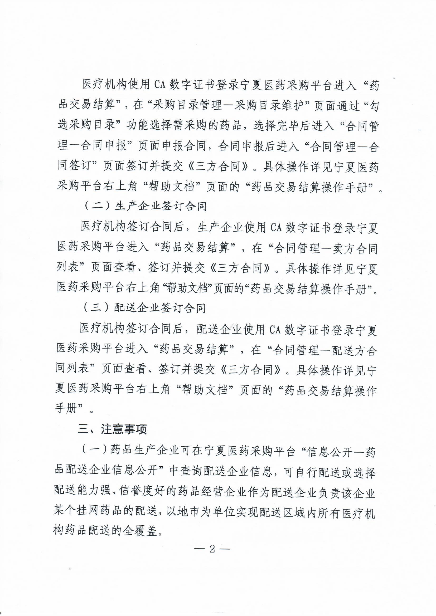 医疗机构签订合同后,配送企业使用CA数字证书登录宁夏医药采购平台进入“药品交易结算”,在“合同管理一配送方合同列表"页面查看、签订并提交《三方合同》。具体操作详见宁夏医药采购平台右上角“帮助文档”页面的“药品交易结算操作手册”。