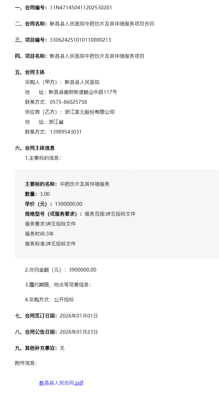 【绍兴市新昌县人民医院】浙江省绍兴市新昌县人民医院中药饮片及其伴随服务项目合同公告3