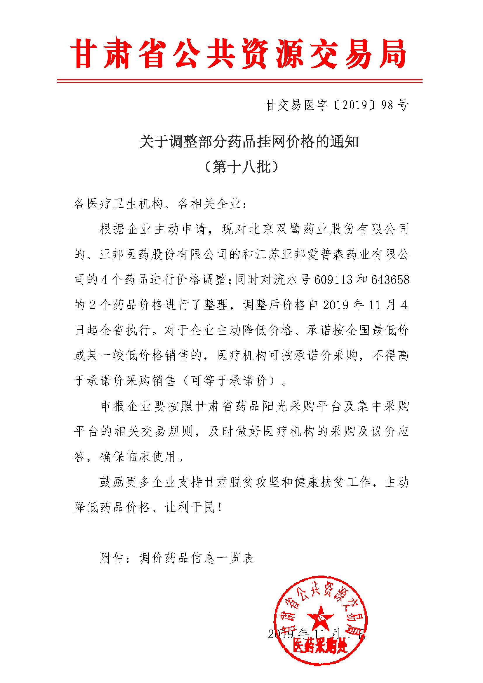【甘肃】甘肃省关于调整部分药品挂网价格的通知 (第十八批) 甘交易医字〔2019〕98 号