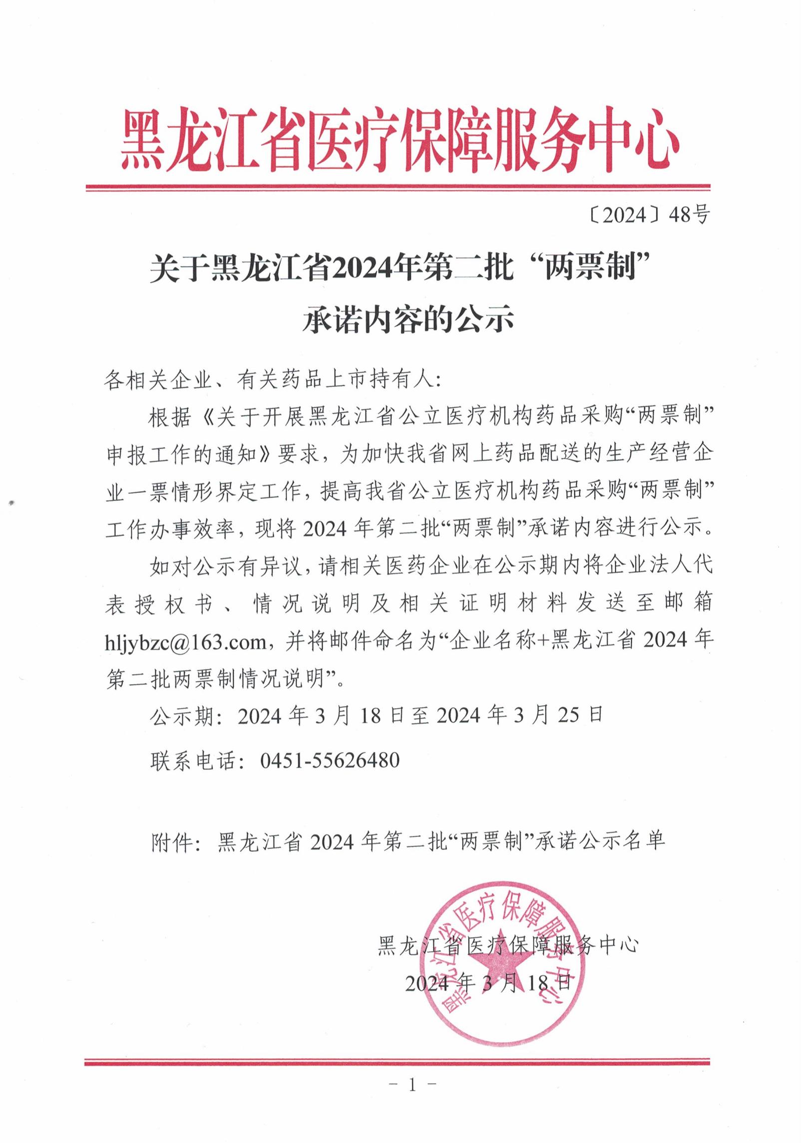 【黑龙江】关于黑龙江省2024年第二批“两票制”承诺内容的公示