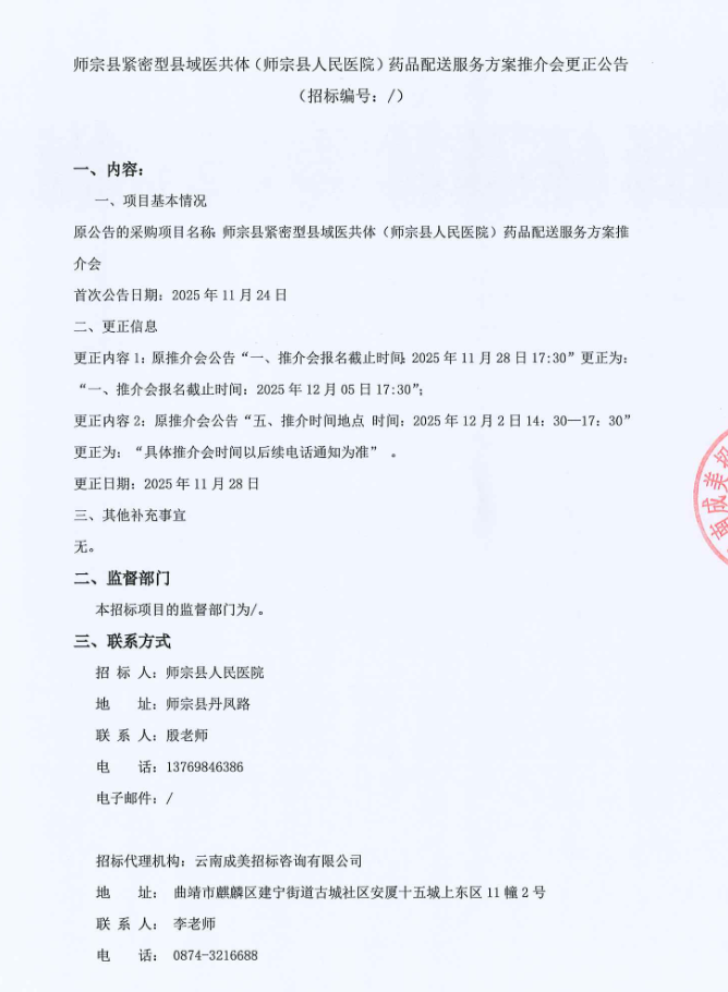 【曲靖市师宗县人民医院】云南省曲靖市师宗县紧密型县域医共体(师宗县人民医院)药品配送服务方案推介会更正公告