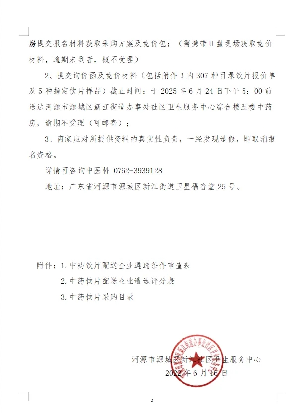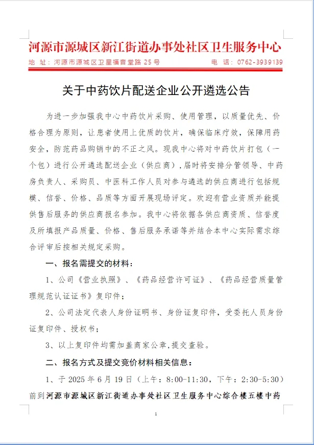 【河源市源城区新江街道办事处社区卫生服务中心】广东省河源市源城区新江街道办事处社区卫生服务中心关于中药饮片配送企业公开遴选公告