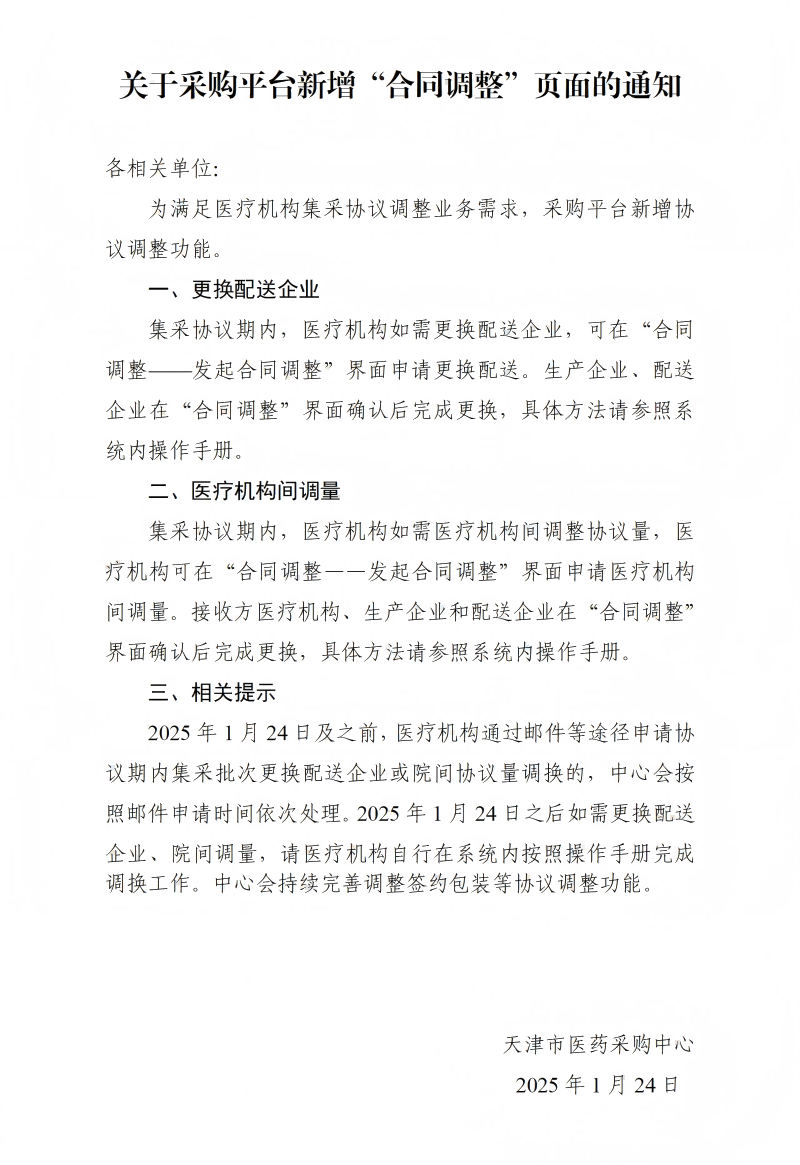 【天津】天津市关于采购平台新增“合同调整”页面的通知