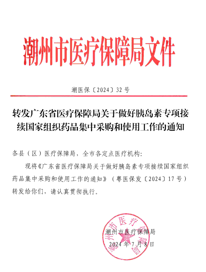 【潮州】潮医保〔2024〕32号 转发广东省医疗保障局关于做好胰岛素专项接续国家组织药品集中采购和使用工作的通知