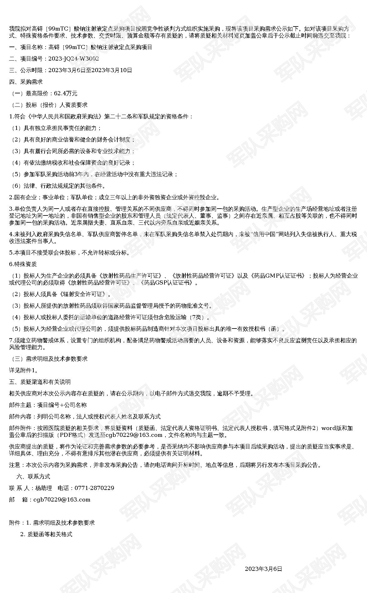 【南宁市某医院】军队采购网南宁市某医院高锝[99mTC]酸钠注射液定点采购项目需求公示(项目编号:2023-JQ24-W3002)