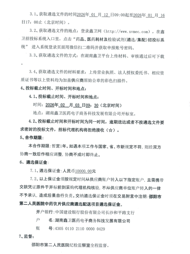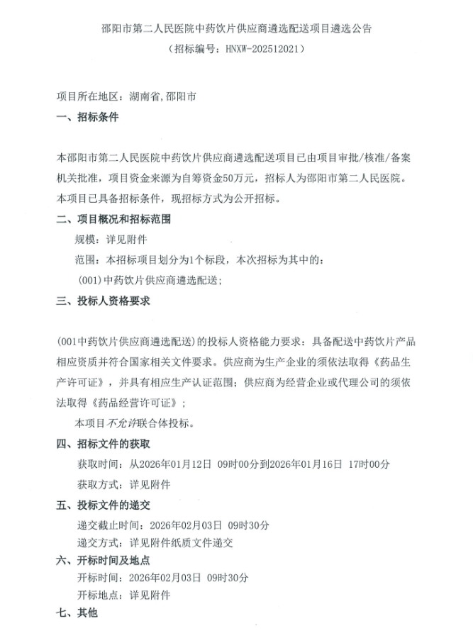 【邵阳市第二人民医院】湖南省邵阳市第二人民医院中药饮片供应商遴选配送项目遴选公告