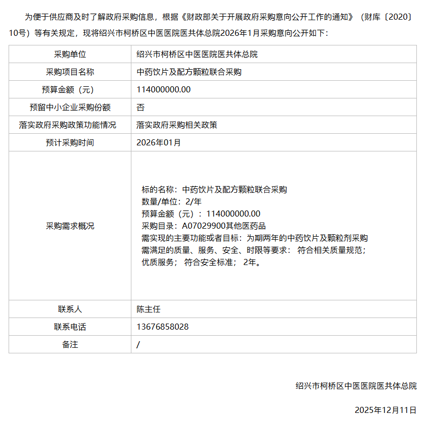 【绍兴市柯桥区中医医院】浙江省绍兴市柯桥区中医医院医共体总院2026年1月政府采购意向