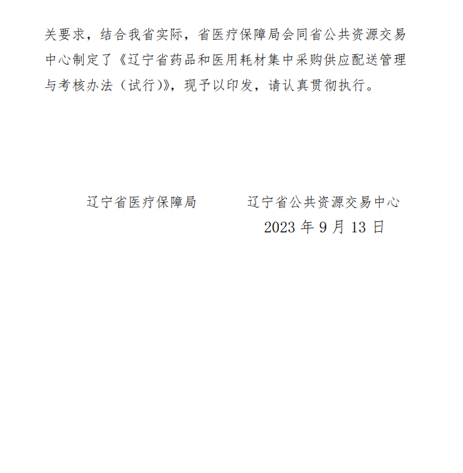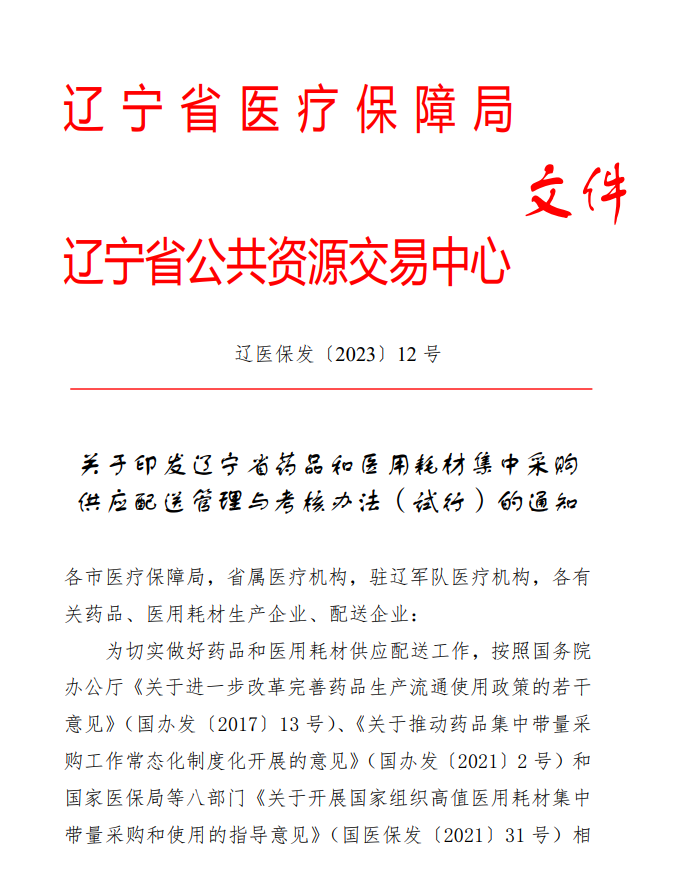 【辽宁】关于印发辽宁省药品和医用耗材集中采购供应配送管理与考核办法(试行)的通知