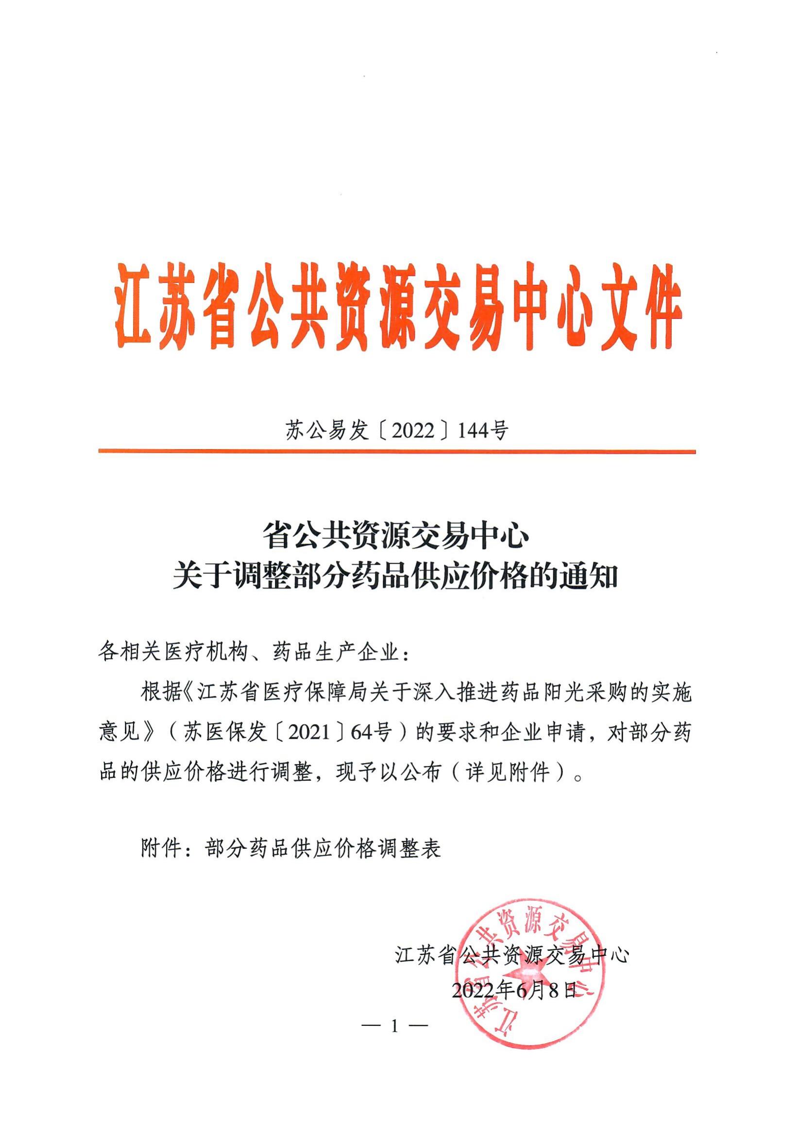【江苏】江苏省公共资源交易中心关于调整部分药品供应价格的通知(20220608)