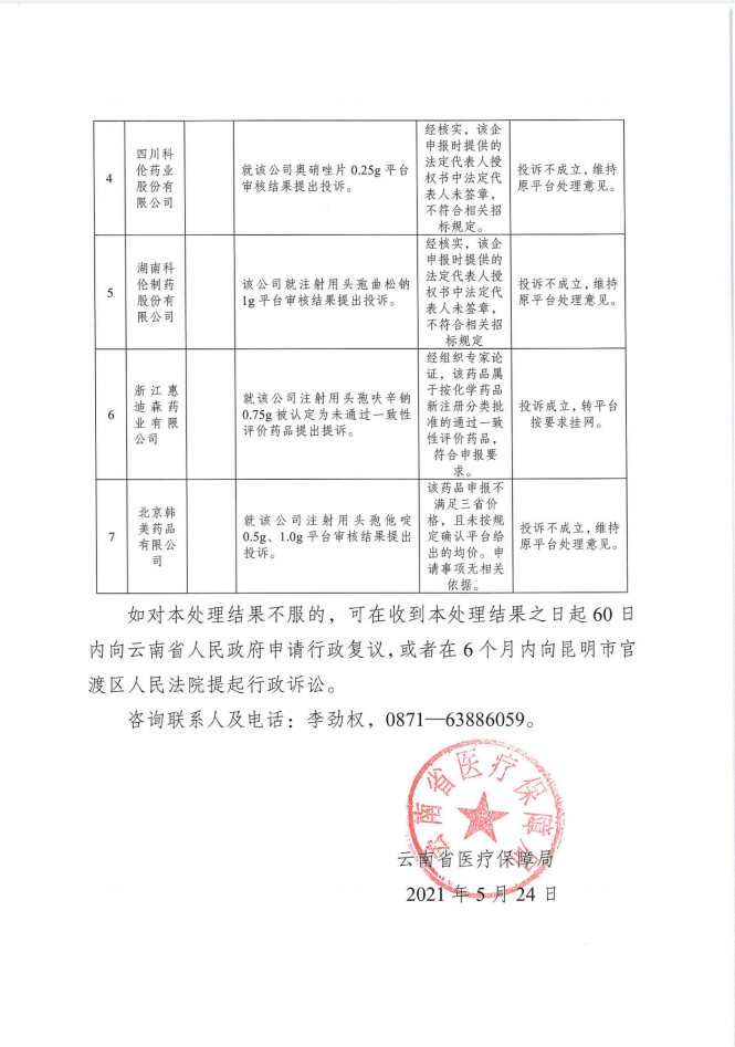 【云南】2021年云南省医疗保障局关于按化学药品新注册分类批准药品和通过一致性评价药品信息审核结果投诉处理结果公告