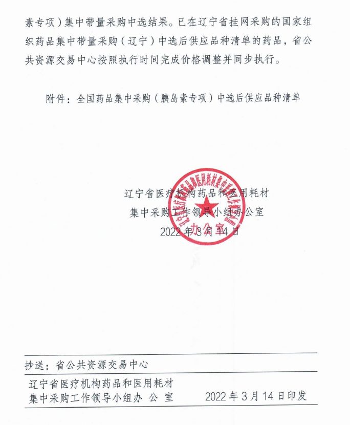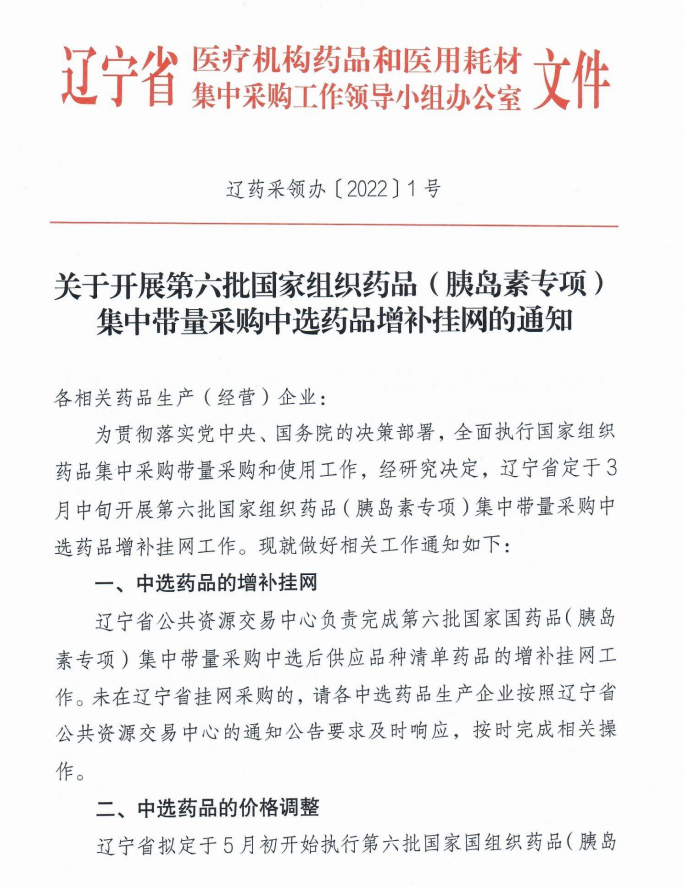 【辽宁】关于开展第六批国家组织药品(胰岛素专项)集中带量采购中选药品增补挂网的通知