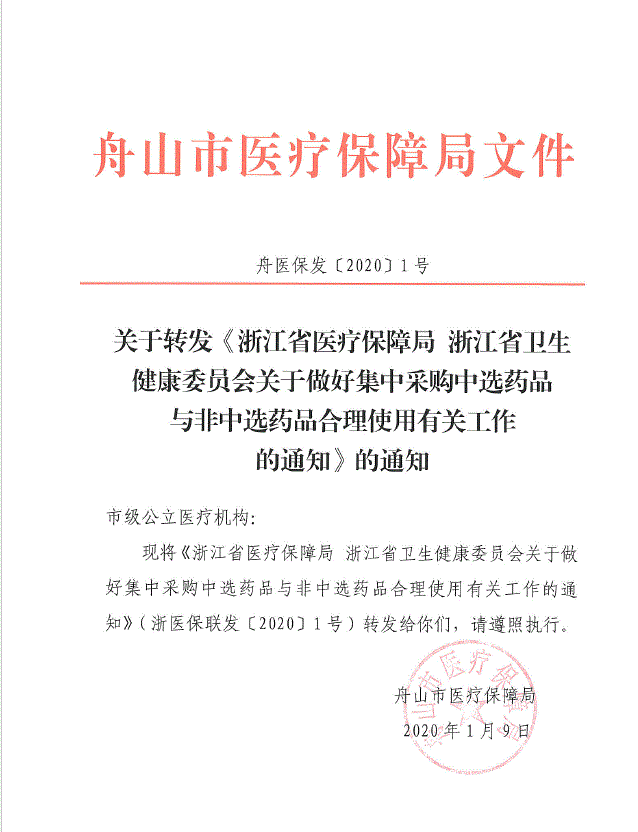 【舟山】浙江省舟山市医疗保障局关于转发《浙江省医疗保障局浙江省卫生健康委员会关于做好集中采购中选药品与非中选药品合理使用有关工作的通知》的通知