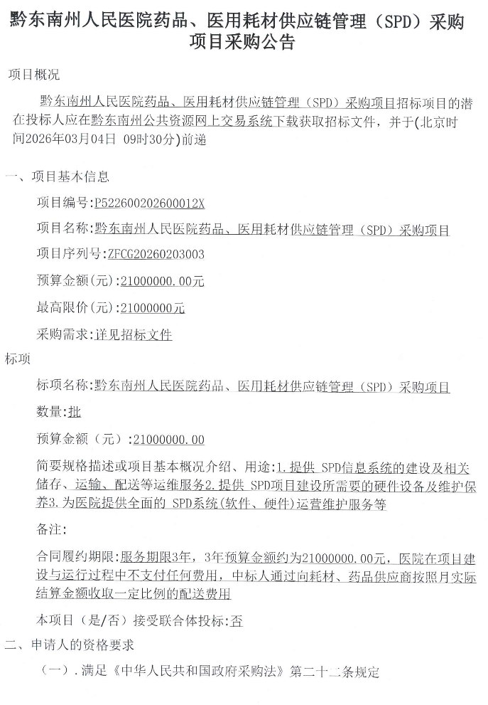 【黔东南州人民医院】贵州省黔东南州人民医院药品、医用耗材供应链管理(SPD)采购项目采购公告