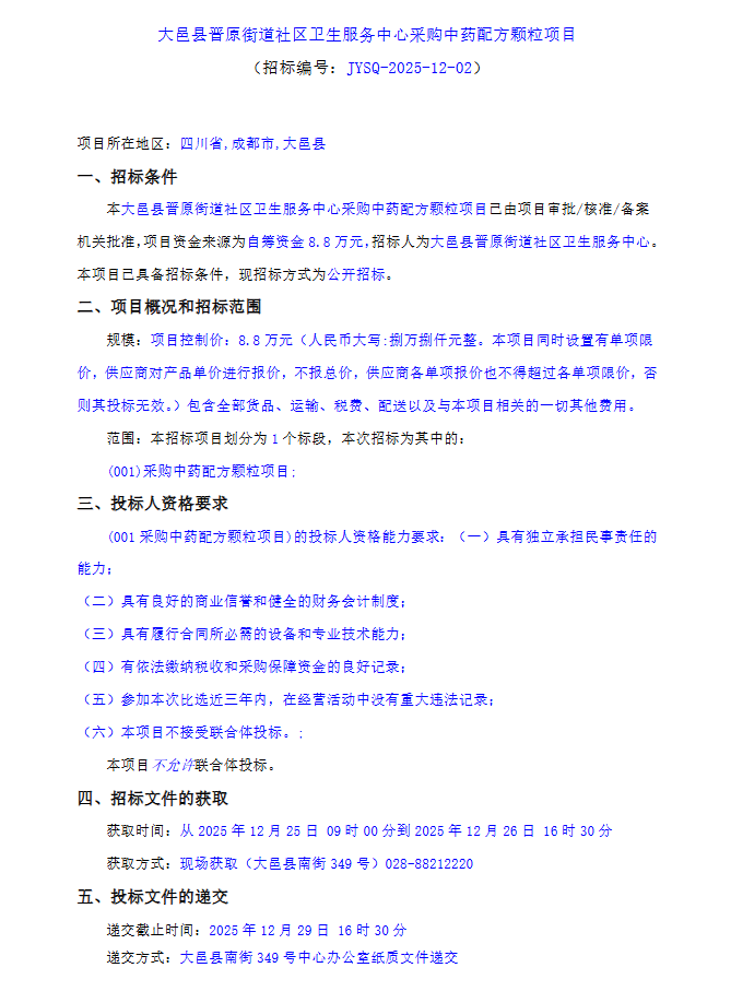 【成都市大邑县晋原街道社区卫生服务中心】四川省成都市大邑县晋原街道社区卫生服务中心采购中药配方颗粒项目