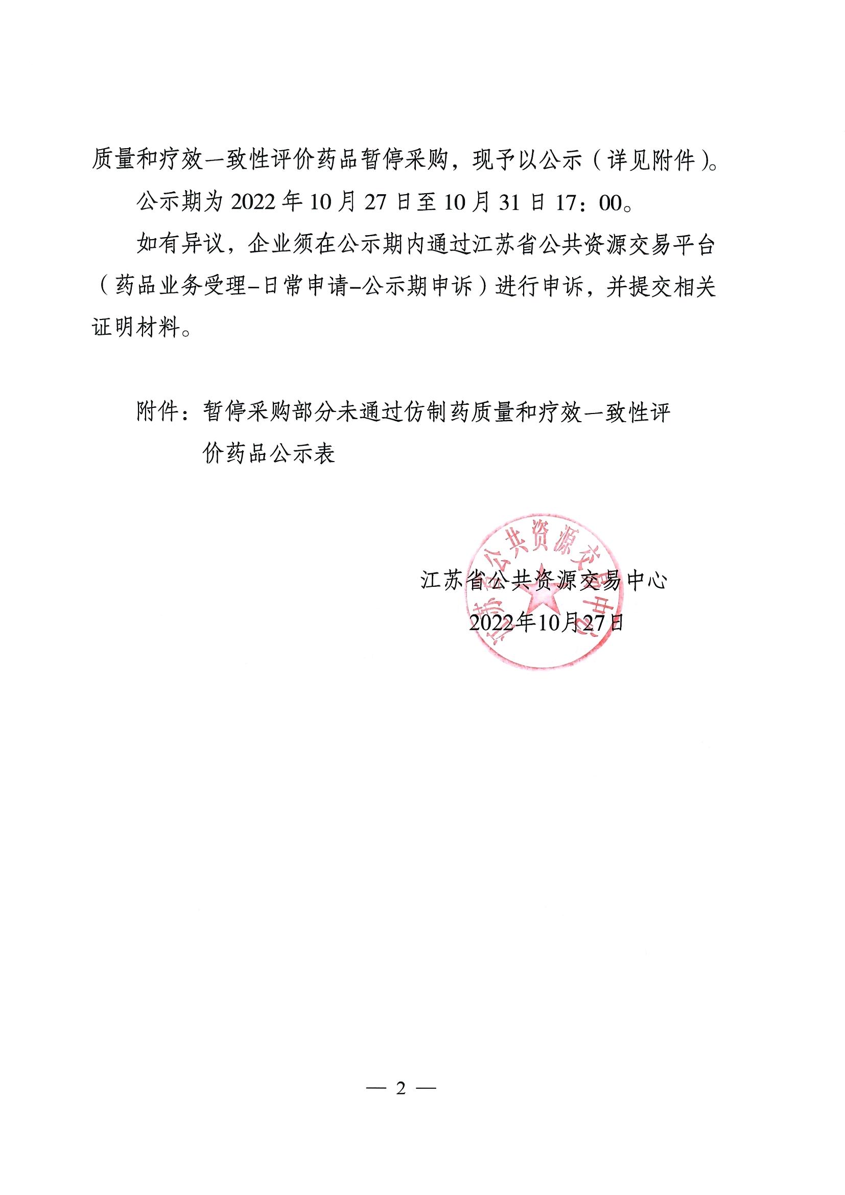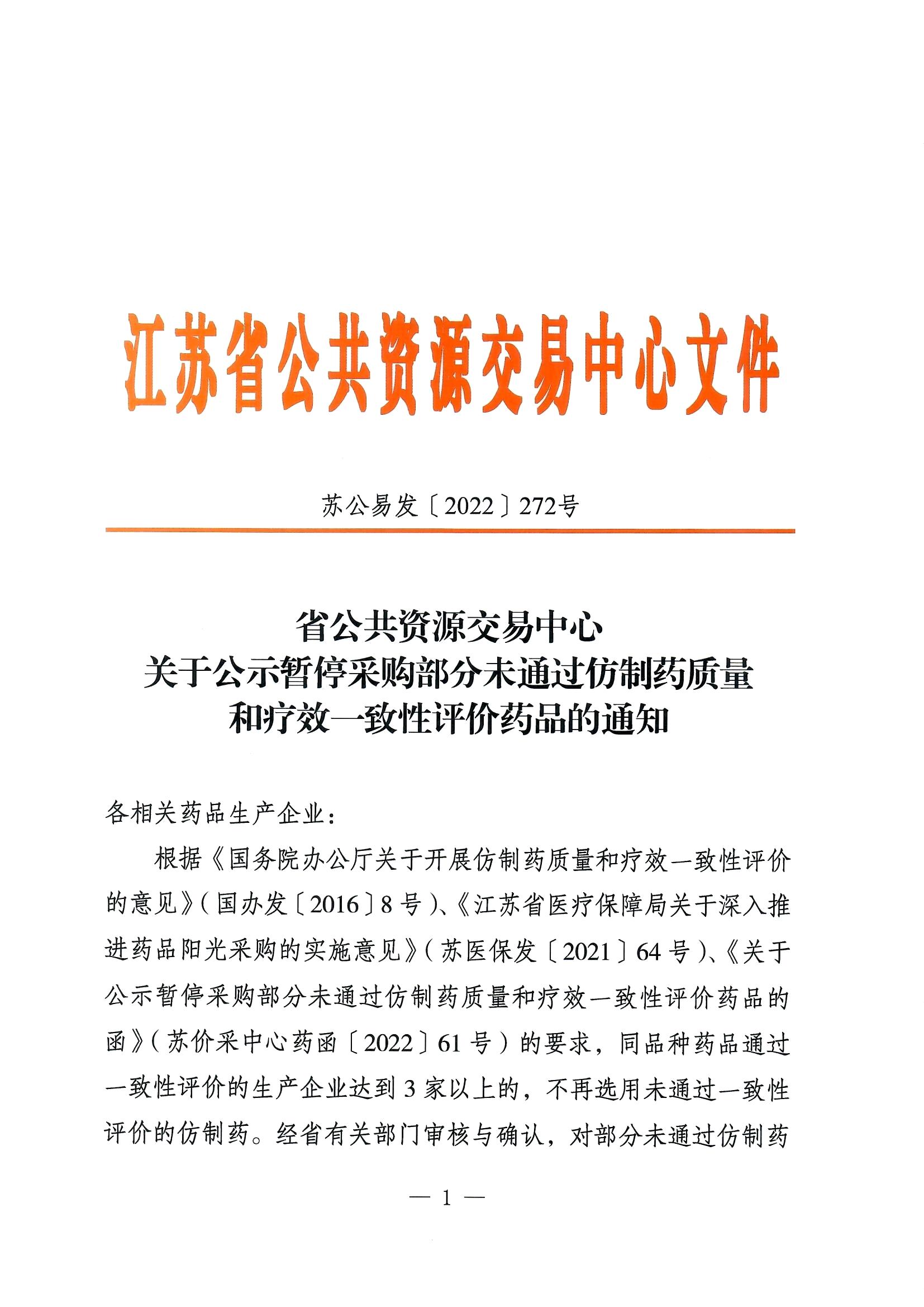 【江苏】江苏省省公共资源交易中心关于公示暂停采购部分未通过仿制药质量和疗效一致性评价药品的通知(苏公易发〔2022〕272号)