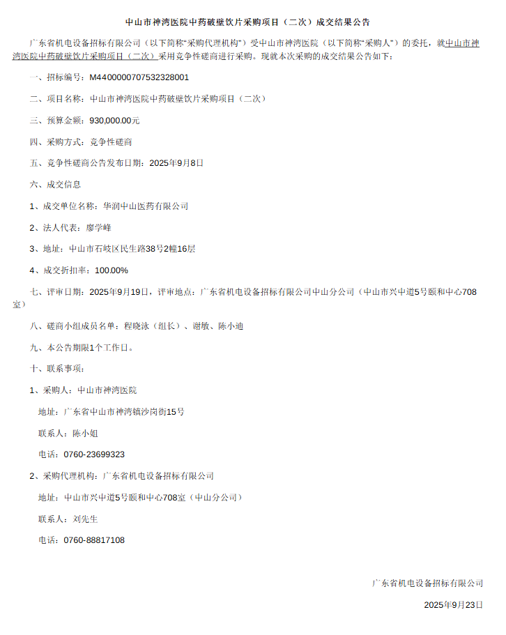 【中山市神湾医院】广东省中山市神湾医院中药破壁饮片采购项目(二次)成交结果公告