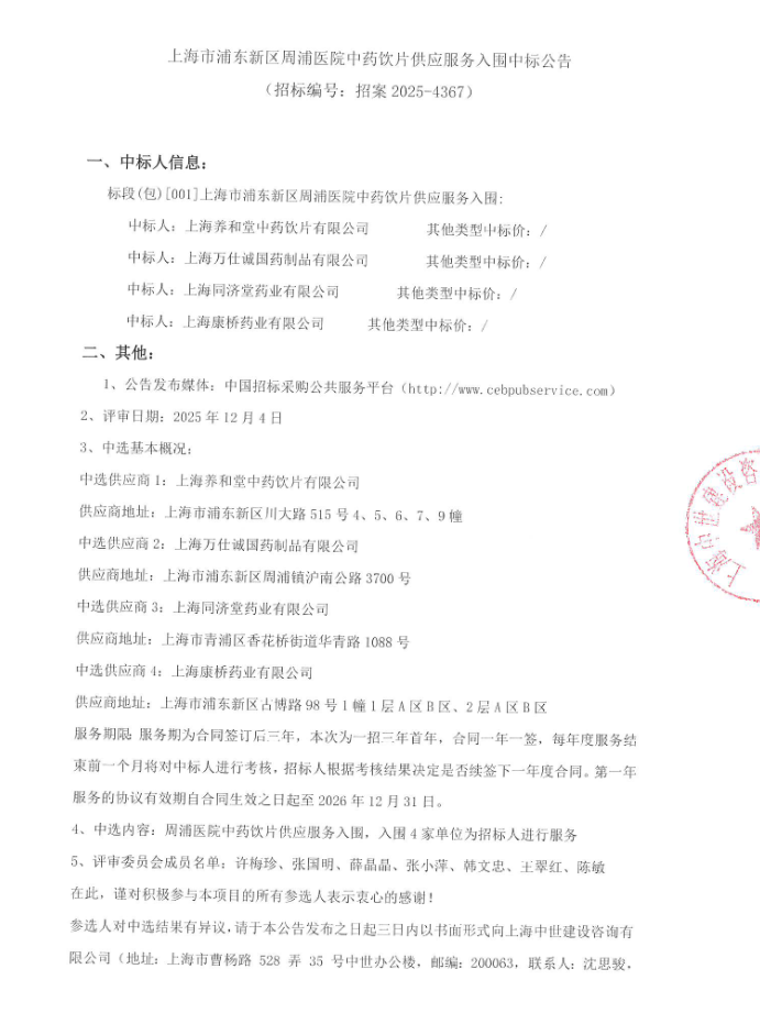 【上海市浦东新区周浦医院】上海市浦东新区周浦医院中药饮片供应服务入围中标公告