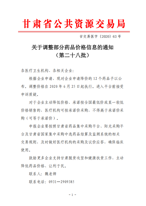 【甘肃】甘肃省关于调整部分药品价格信息的通知(第二十八批)