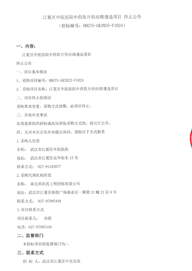 【武汉市江夏区中医医院】湖北省武汉市江夏区中医医院中药饮片供应商遴选项目终止公告