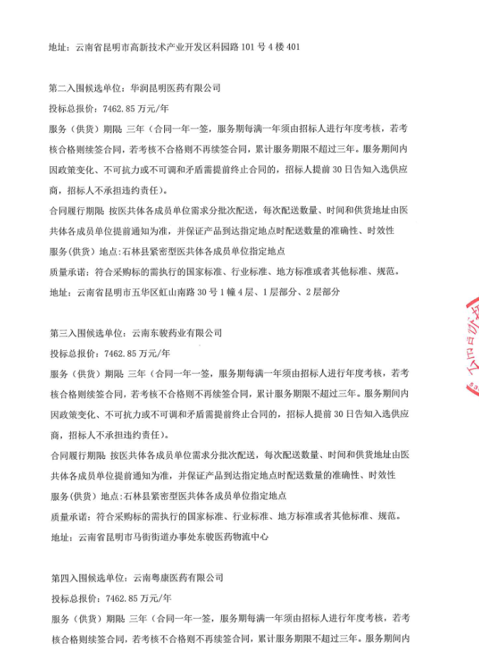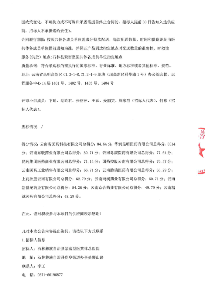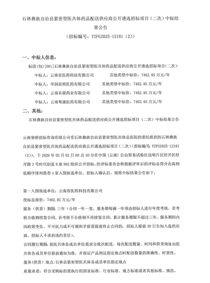 【昆明市石林彝族自治县紧密型医共体总医院】云南省昆明市石林彝族自治县紧密型医共体药品配送供应商公开遴选招标项目(二次)中标结果公告