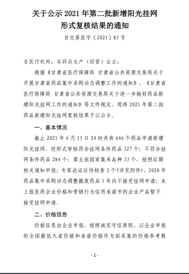 【甘肃】甘肃省关于公示2021年第二批新增阳光挂网形式复核结果的通知