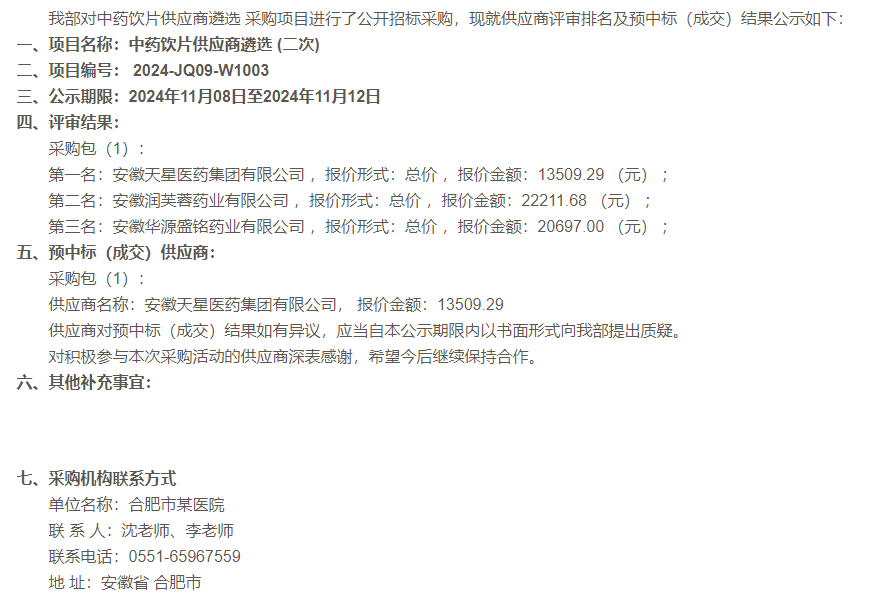 【军队采购】军队采购网合肥市某医院中药饮片供应商遴选 (二次)采购结果公示(2024-JQ09-W1003)