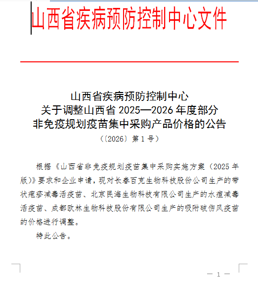 【山西】山西省疾病预防控制中心关于调整山西省2025—2026年度部分非免疫规划疫苗集中采购产品价格的公告