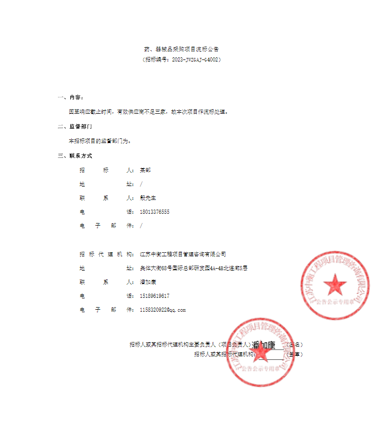 【南京市雨花台区某部】江苏省南京市雨花台区某部药、器械品采购项目流标公告