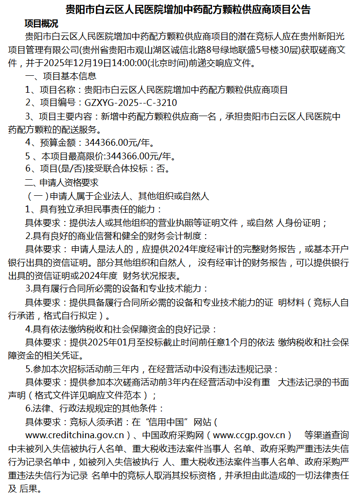 【贵阳市白云区人民医院】贵州省贵阳市白云区人民医院增加中药配方颗粒供应商项目招标公告