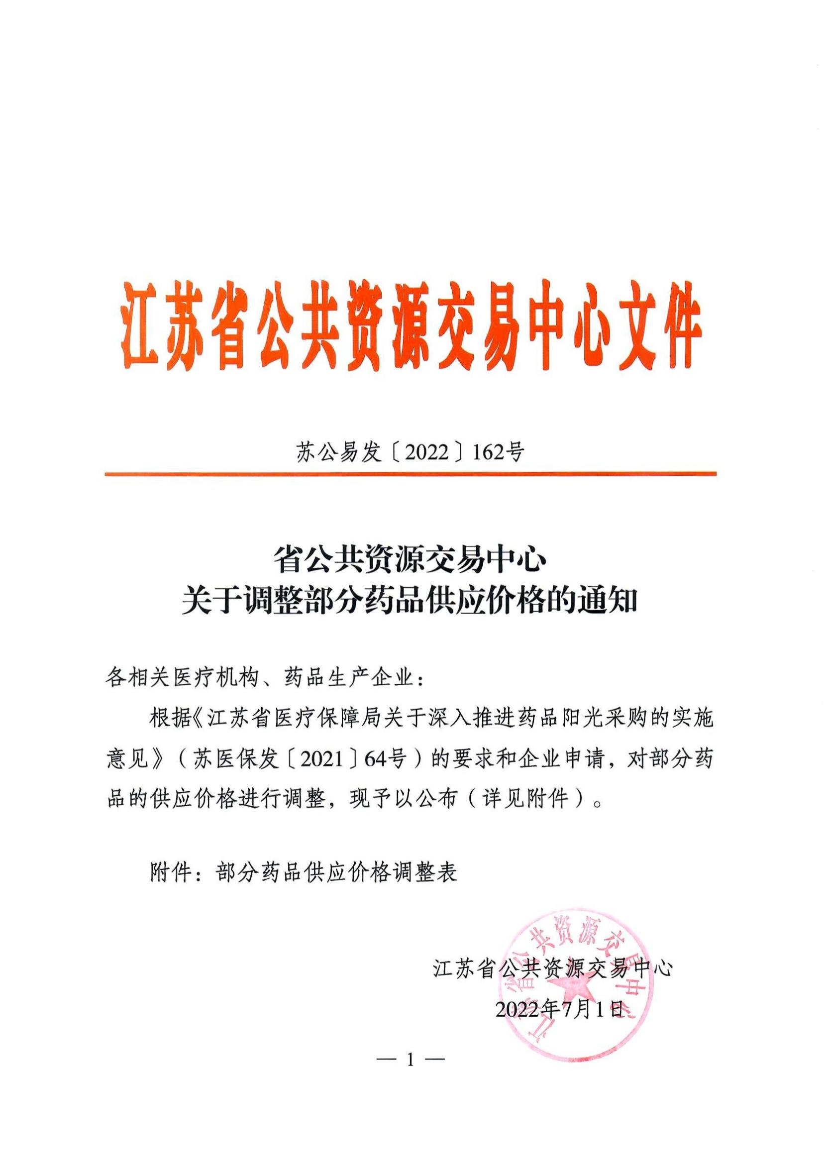 【江苏】江苏省省公共资源交易中心关于调整部分药品供应价格的通知