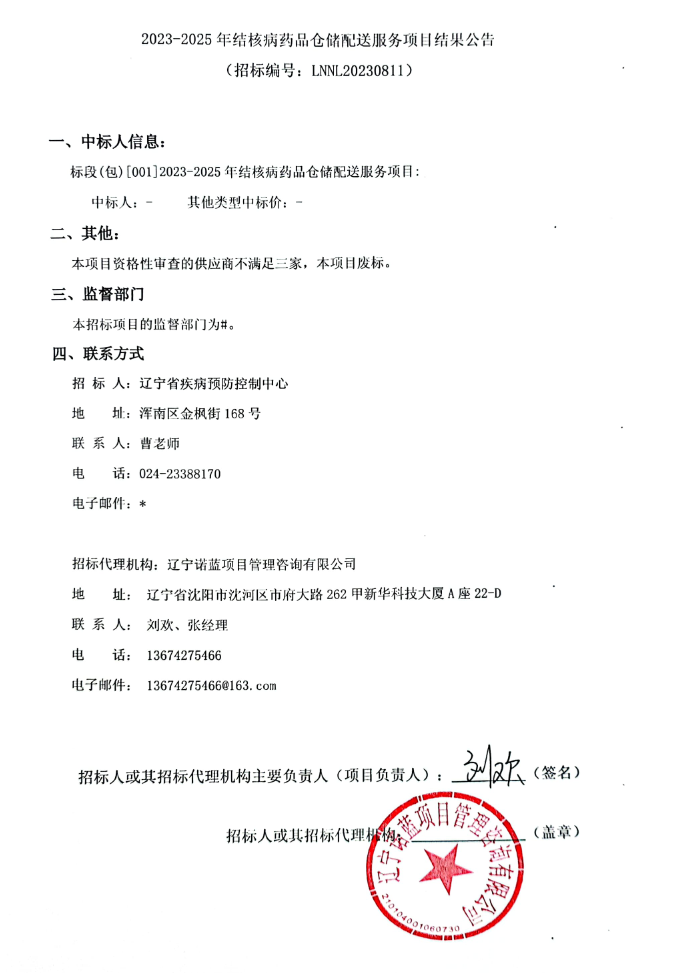 【辽宁省疾病预防控制中心】辽宁省疾病预防控制中心2023-2025年结核病药品仓储配送服务项目结果公告