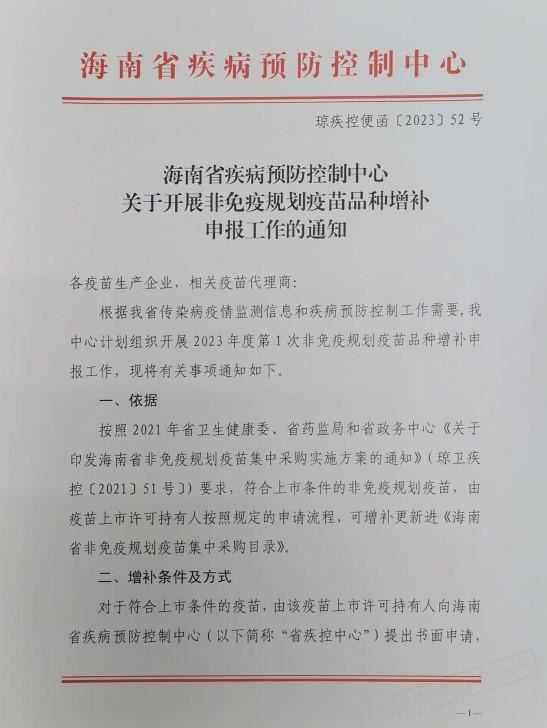 按照2021年省卫生健康委、省药监局和省政务中心《关于印发海南省非免疫规划疫苗集中采购实施方案的通知》(琼卫疾控〔2021〕51号〕)要求,符合上市条件的非免疫规划疫苗,由疫苗上市许可持有人按照规定的申请流程,可增补更新进《海南省非免疫规划疫苗集中采购目录》