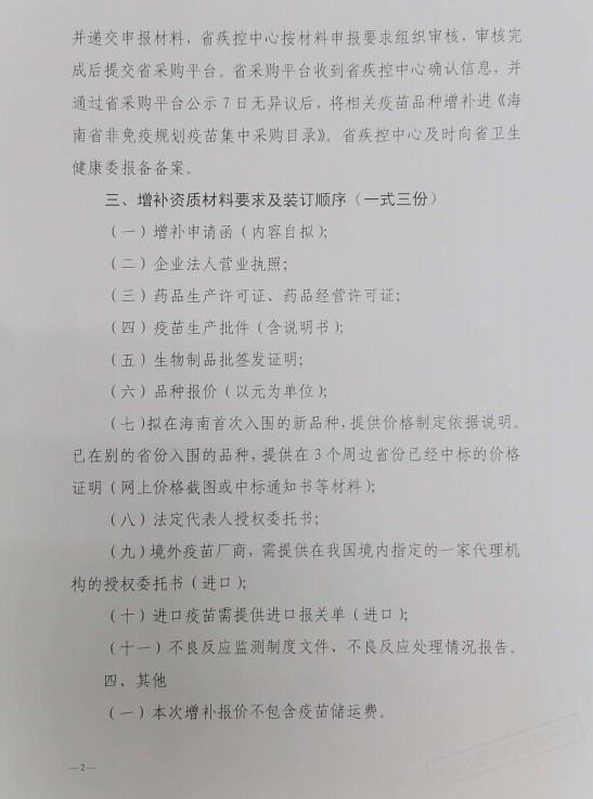 对于符合上市条件的疫苗,由该疫苗上市许可持有人向海南省疾病预防控制中心(以下简称“省疾控中心”)提出书面中请,并递交甲报材料,省疾控中心按材料申报要求组织审核,审核完成后提交省采购平台。省采购平合收到省疾控中心确认信息,并通过省采购平合公示7日无异议后,将相关疫苗品种增补进《海南省非免疫规划疫苗集中采购目录》,省疾控中心及时向省卫生健康委报备备案。