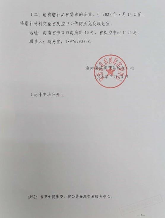 (二)请有增补品种需求的企业,于2023年8月14日前,将增补材料交至省疾控中心传防所免疫规划室。